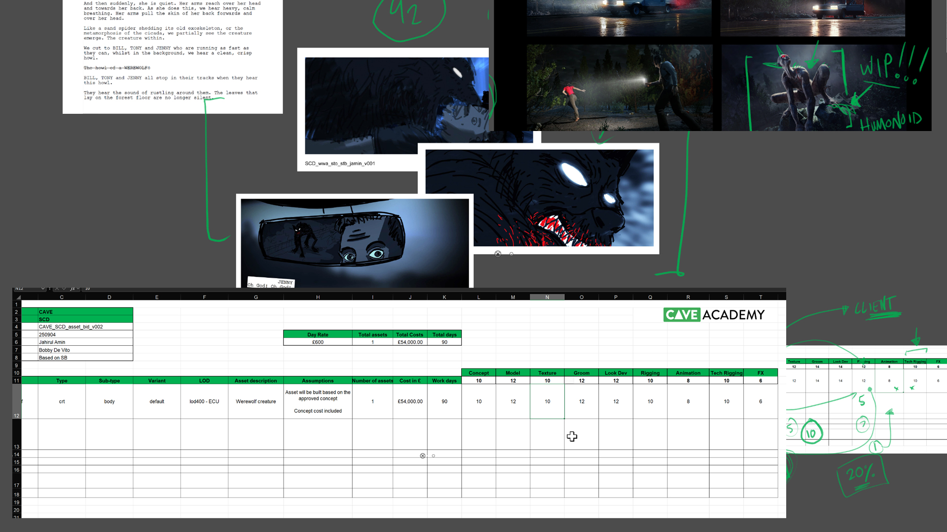 This bidding document has been designed to support you and your teams when planning Assets for a show. You can pop in how many days it will take for modelling, texturing, rigging, etc. and have the spreadsheet do all the maths to tally up the final numbers. The number can then be multiplied with your day rate and bish, bash, bosh, this can then be submitted to your client for sign off. Once approved, the data can then be ingested into your tracking software of choice (ShotGrid, FTrack, etc.).